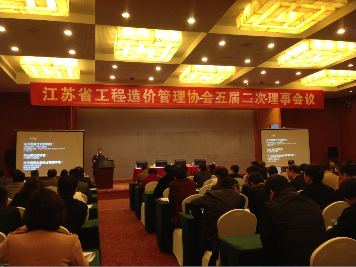 2014年3月20日,江苏省工程造价管理协会第五届第二次理事会在苏州香山国际会议中心举行。出席会议的理事有122个。会议请南京大学耿强教授作了关于宏观经济、金融形势和货币政策的专题报告,请江苏捷宏工程咨询有限责任公司许捷董事长作了关于企业发展的专题报告,请江苏安厦工程项目管理有限公司翟春安总经理作了关于企业文化建设的专题报告。省造价协会理事长王如三向理事会议作了工作报告。苏州市住建局副局长董慈华到会致辞。会议由江苏省造价协会秘书长、省造价总站站长曹良春主持。