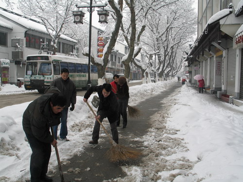 连日来的暴雪造成的极端灾害性天气给我市市民出行带来了很大不便,我处全体职工响应市委、市政府的号召,在侯建江处长的带领下第三次冒着风雪走上街头扫雪。连续的暴雪使街上的积雪最厚处超过了30公分,低温的天气也使很多路段都结了冰,寸步难行,在如此恶劣的环境下,在只有一把铁锹、三把扫帚的情况下,我处全体职工众志成城、轮番上阵,终于打通了一条近1千米长、2米多宽的道路,极大的方便了过往路人和自行车、电瓶车的通行,保障了人民群众的安全。