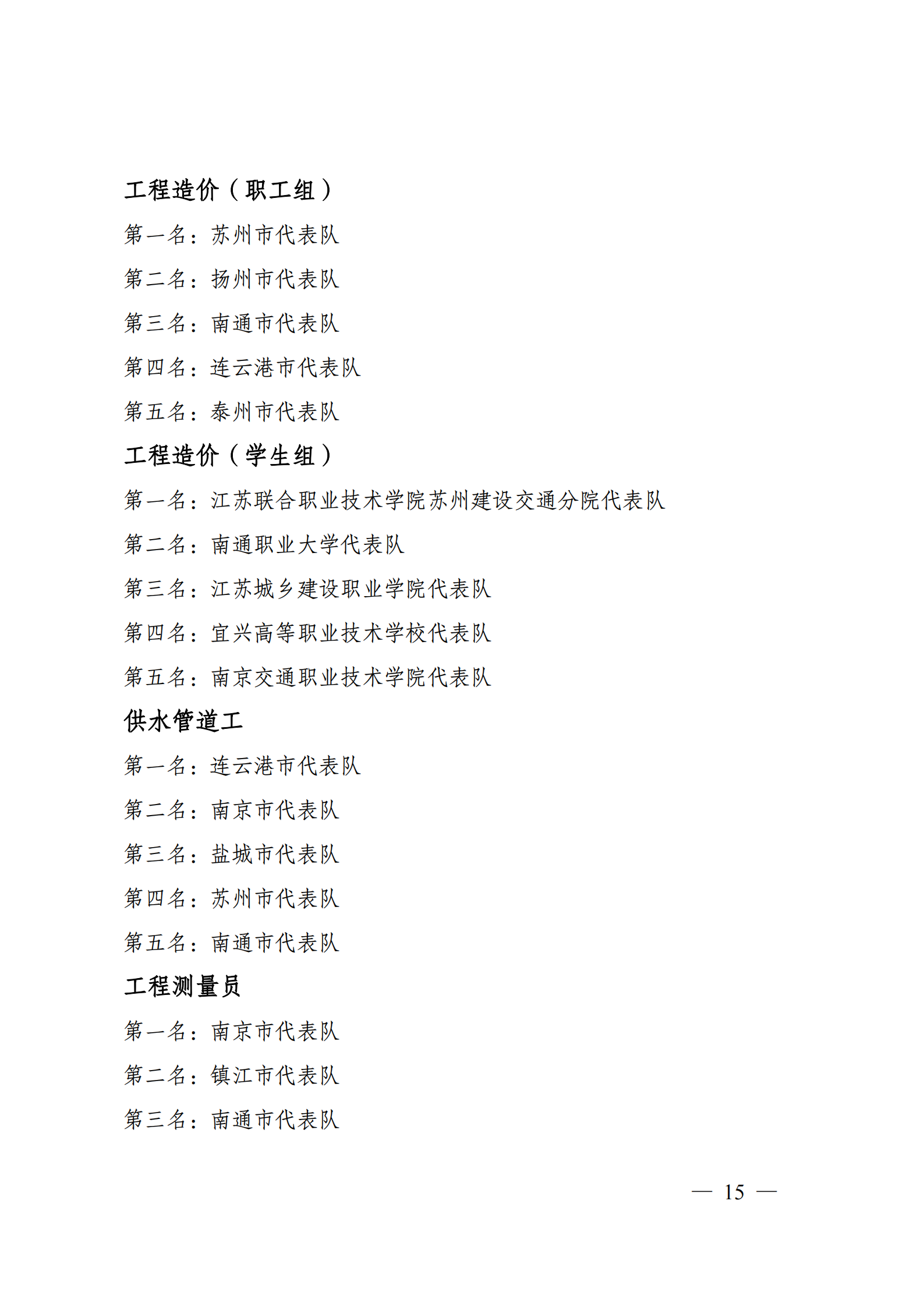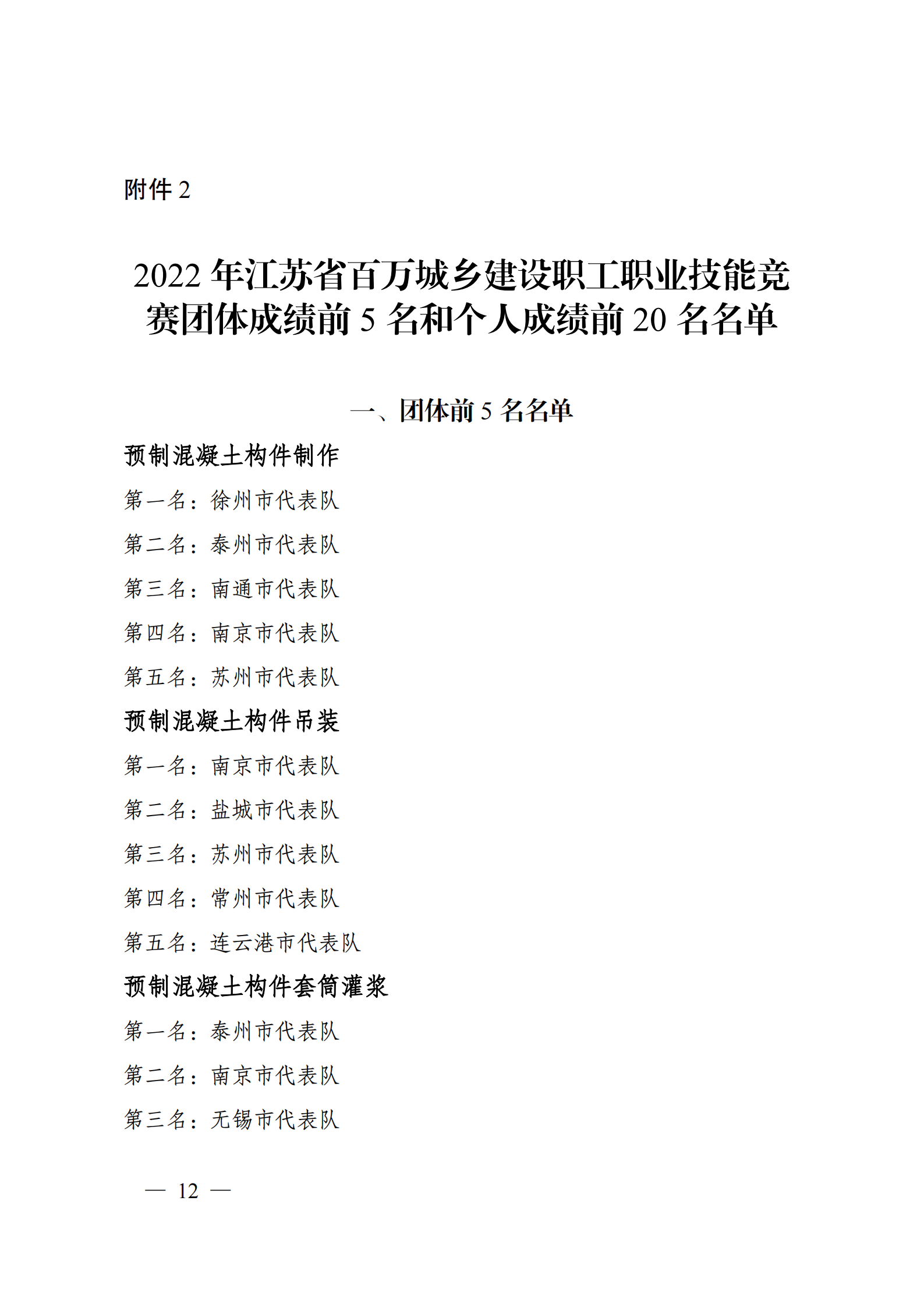 关于2022年江苏省百万城乡建设职工职业技能竞赛结果的通报