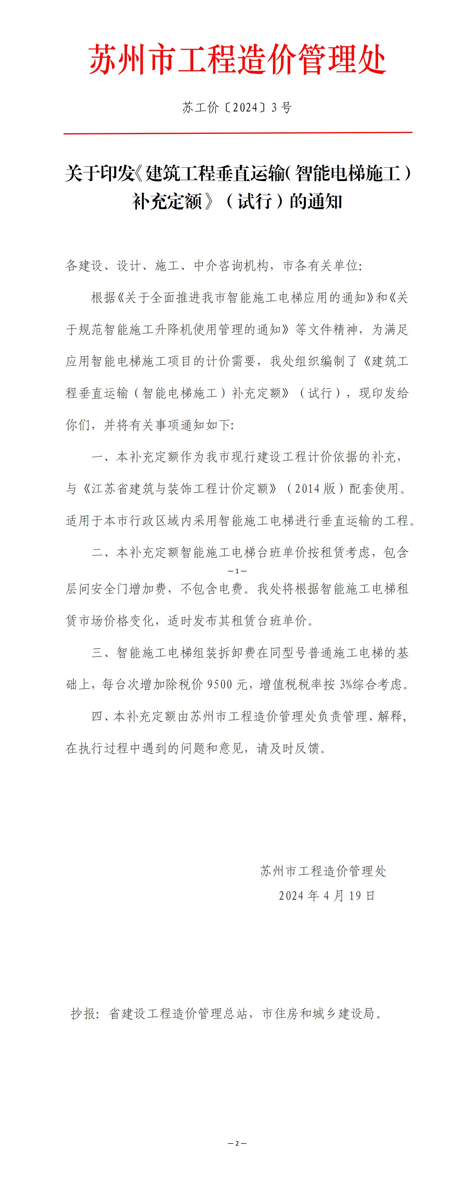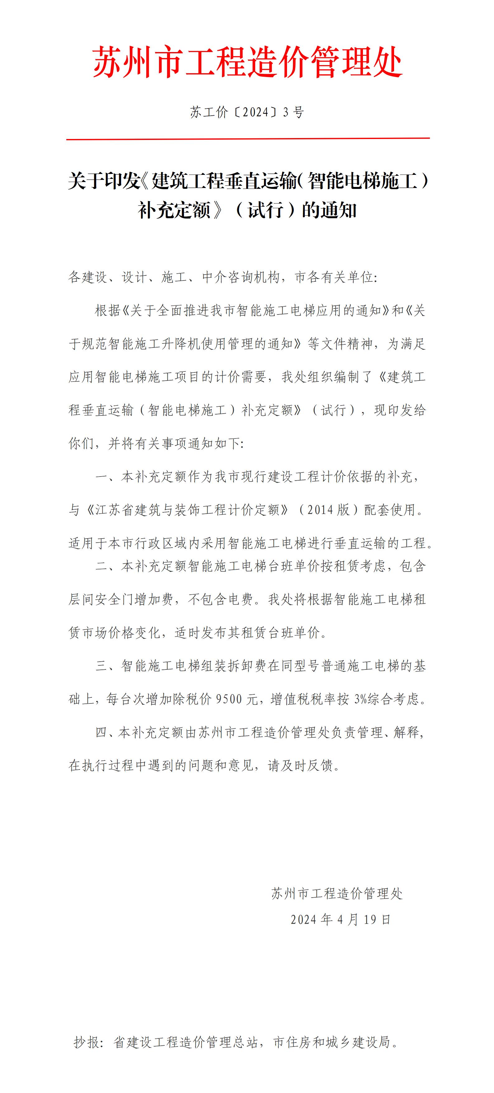 关于印发《建筑工程垂直运输(智能电梯施工)补充定额》(试行)的通知