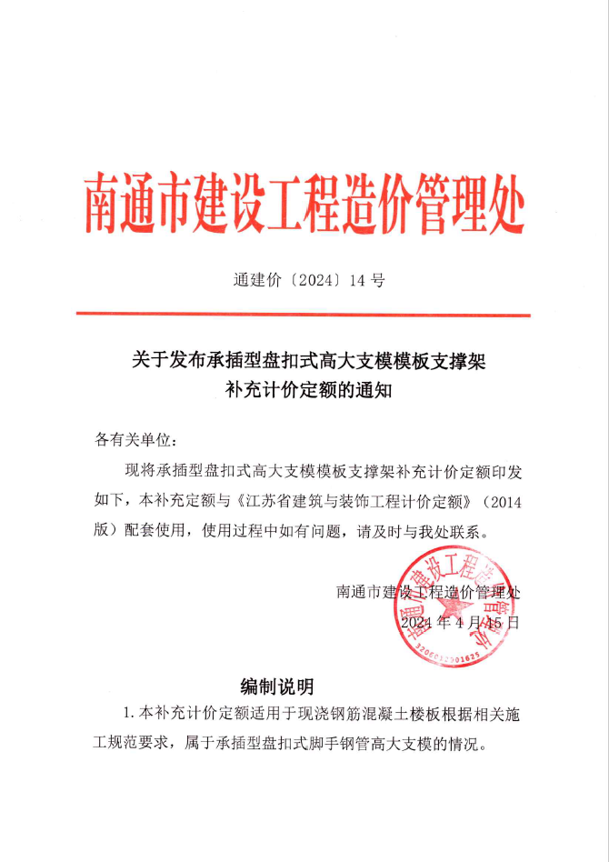 关于发布承插型盘扣式高大支模模板支撑架补充计价定额的通知